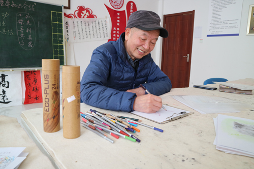 吴国梁在创作社区漫画 两个“自画像”的角色 在舜园社区的三楼,吴国梁有自己的工作室,墙面上挂满了他近年来创作的漫画。